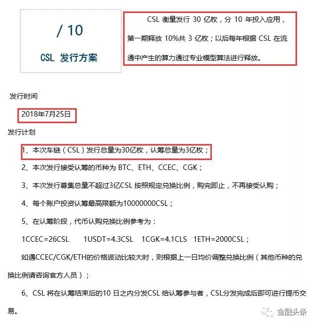 根据白皮书,车链(CSL)总发行量30 亿枚,分 10 年投入应用,第一期释放10%参与认购,共3 亿枚。俞凌雄的一位代理表示,认筹价格为每枚CSL2元。这意味着,这一轮的募资总额将高达6亿元。