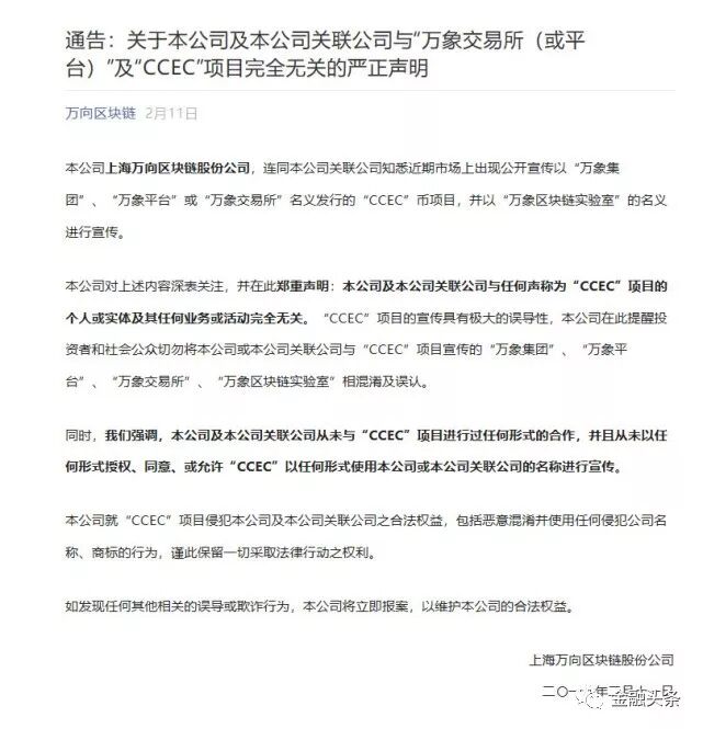 俞凌雄旗下的万象交易所上线之初,也发生过类似的乌龙事件。万象交易所最初使用“万象区块链实验室”的名义进行宣传,直到万向区块链微信公众号发布公告,称以“万象集团”、“万象平台”或“万象交易所”名义发行的“CCEC”币项目,均与上海万向区块链股份公司及关联公司完全无关。